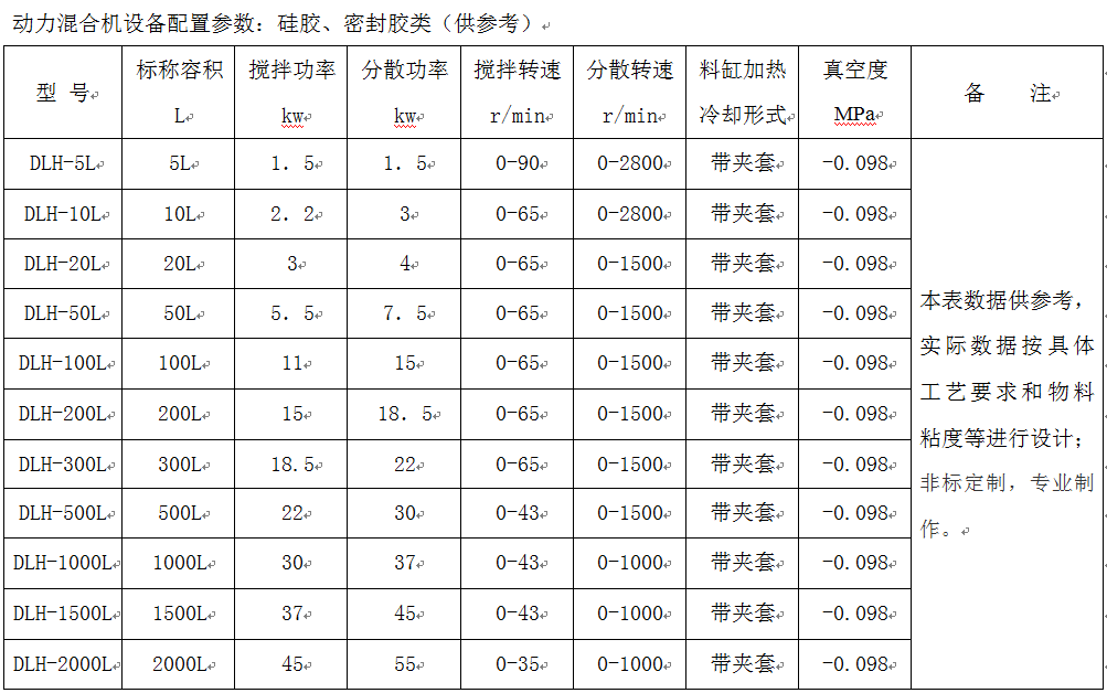 MS密封膠行星動(dòng)力混合機(jī)|真空攪拌機(jī)配置參數(shù)表:(常規(guī)的容量、功率、轉(zhuǎn)速等數(shù)據(jù)表,其它更大容積的未作描寫(xiě))