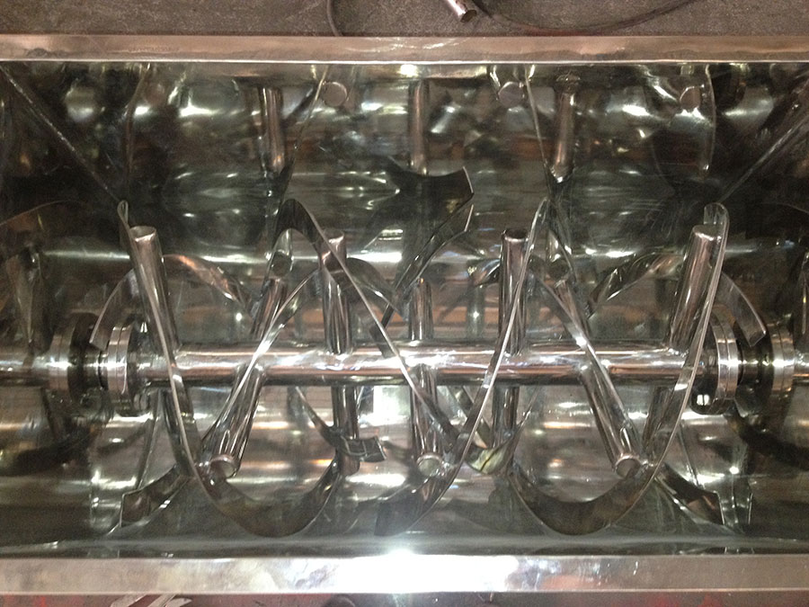 雙螺帶混合機是快速、應(yīng)用廣泛的單軸混合機,U形半開管狀筒體內(nèi)安裝雙層異向螺帶盤繞的攪拌器軸。盤旋的螺旋帶依附主軸運轉(zhuǎn),外螺旋帶在動力的驅(qū)動下,其盤繞形式配合旋轉(zhuǎn)方向把物料從U型倉兩端向中部地帶推動,能推使物料隨螺旋帶蝸旋方向推進,而內(nèi)螺旋帶把物料從中間向兩端推動,形成對流混合?;旌蠙C臥式筒體底部中部開設(shè)出料口,外層螺旋帶的蝸旋結(jié)構(gòu)配合主軸旋轉(zhuǎn)方向驅(qū)趕筒壁內(nèi)側(cè)物料至中部出料口出料,確保筒體內(nèi)物料出料無死角。筒蓋可做成投料口或全開式門,以便于對設(shè)備進行清洗??稍诨旌蠙C筒體外增加夾套,通過向夾套內(nèi)注入冷熱介質(zhì)來實現(xiàn)對物料的冷卻或加熱;出料形式一般為氣動、手動閥,與筒內(nèi)壁較為齊平,減少物料堆積和混合死角現(xiàn)象。您可以提出您所需要的處理量、設(shè)備形式、規(guī)格要求或您需要加工的物料的性質(zhì),碩宸的銷售工程師會提供讓您滿意的方案。